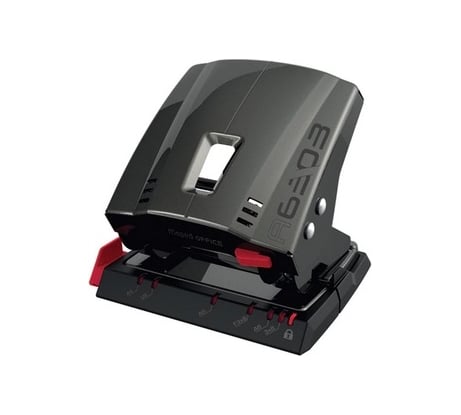 Мощьный, надежный дырокол. С легкостью прошивает толстые пачки бумаги. Есть фиксатор сложеного положения. Удобный выдвижной упор для бумаги.