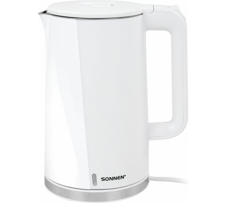 Весьма неплохой чайник, особенно за свою цену (я покупал за 1168р). Единственное, что не понравилось - враньё насчет мощности. До этого у меня был чайник SkyLine KR-307 G: Объем - 1.7 л Тип управления - электрический Мощность - 2200 (Вт) Материал корпуса - термостойкое стекло Цвет корпуса - черный Фильтр от накипи - есть Нагревательный элемент - скрытый Подсветка воды - да Сравните, кстати, эти характеристики с характеристиками данного чайника (Sonnen) - они полностью совпадают (остальные отличаются). Так вот, был чайник, но сломался термостат. Я искал наиболее подходящую замену и думал, что нашёл ее в этом чайнике Sonnen. Но меня очень удивило, что на его подставке была указана мощность 1850-2200 Вт, а не просто 2200 Вт. Я это заметил только дома. Кипятит он действительно медленнее - тот прежний кипятил почти мгновенно. Например, 1л холодной воды из-под крана Sonnen кипятит 4 минуты. Даже чуть дольше. Какова мощность? Скажем, температура холодной воды равна 10°C (я специально измерял термометром). А нагреть надо до 100°C. Значит, dT=90°C. Литр воды весит m=1кг. Теплоемкость воды c=4200 Дж/кг/°C. Значит, данному объему воды нужно передать теплоты в количестве Q=c*m*dT=4200*1*90=378000 (Дж). Делим это на 240 секунд (4 минуты) и получаем мощность 1575 Вт. Это очень и очень средняя мощность, весьма посредственная. Короче, насчет мощности меня "нагрели", как тот самый чайник...