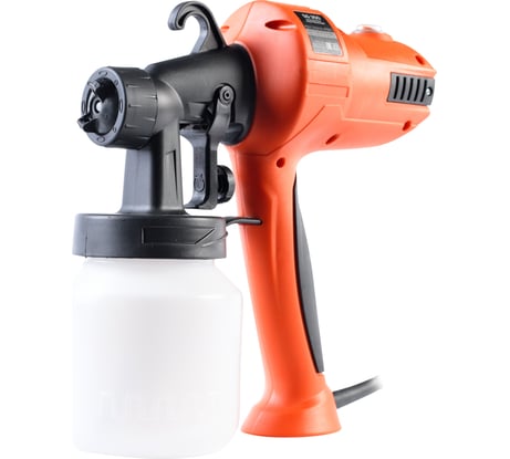 Мощный. Красил водоэмульсионной краской кирпичную стену. 2 насадки в комплекте. Большой бак на 1,3 л.