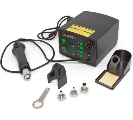 Легкое и простое управление. Есть металлический держатель для горячего паяльника. Большой набор насадок в комплекте.