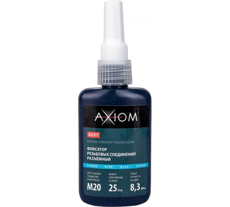 Фиксатор резьбы AXIOM 50мл синий AS311 Цвет не синий, а ближе к зеленому. Фиксатор гелеобразный, чуть гуще чем Loctite 243 но стекает по резьбе. В бутылке фиксатора меньше чем на треть! Пользовался локтайтом 243 и там тоже указано 50мл, но там бутылка наполнена почти до верху. Поэтому считаю что меня обманули! Брать данного производителя не вижу смысла, цена за обьем выходит такая же как за Loctite.