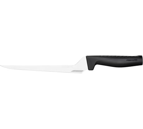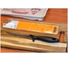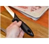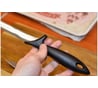 Очень удобный, "мягкий" и упругий, прекрасная эргономичная рукоять, хорошо заточен, оптимальный размер, отлично и без усилий режет, справляется с разными продуктами.