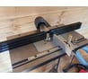 Легкий в сборке и настройке стол. С помощью винтовых ножек с резинками компенсируются неровности пола в мастерской. Высота стола настраивается под размер хозяина – для спины полезно. Смотрится стильно – яркое пятно среди серых будней. Столешница ровная, поверхность шероховатая – заготовки не липнут, скользят по ней хорошо. Главное достоинство – упор. Каждую щечку можно отрегулировать по четырем точкам, легко настраивается перпендикуляр к столешнице. Стружкоприемник полностью закрывает алюминиевый профиль упора – потери всасывания нет, стружку отовсюду выковыривать не придется. Имеется пара переходников под разные диаметры пылесосов. В комплекте идут два откидных упора-ограничителя фрезерования, что очень удобно. есть интересно выполненная тонкая подстройка положения упора на столе.