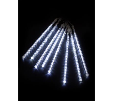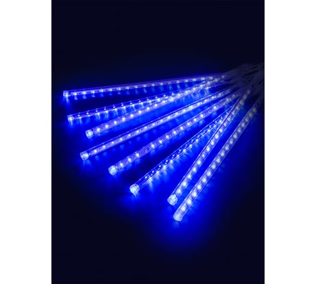 Подходит для уличного новогоднего украшения. Длина гирлянды почти 4 метра. Состоит из 8 ламп свечей длиной 30 см. При включении гирлянды светодиоды в лампах создают эффект непрерывного падающего синего света. Работает от электросети.