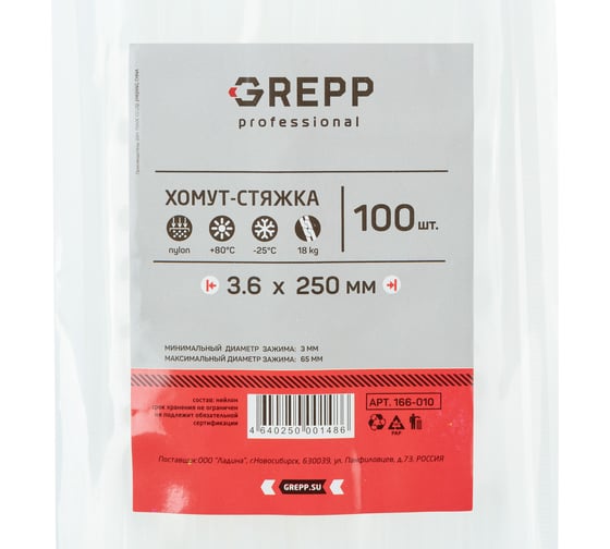 Хомут стяжка GREPP 3.6x250 мм нейлон белый/черный, 100 шт. 166-010