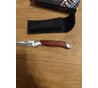 Классический складной нож, с клинком типа клип-поинт стилизованный под легендарную "лисичку". В советское время производился подпольным способом на заводах и очень ценился всеми рыбаками. Он был очень незаменим, когда надо было достать рыболовный крючок с наживкой, у случайно заглотившей его рыбы. И потрошить свежую рыбу для ухи таким ножом тоже было удобно. Нож достаточно тяжеловат. Видно, что он ручного изготовления, но сделан квалифицированными мастерами и достаточно аккуратно! Собран вместо винтов весь на заклёпках. Накладки на рукоятках светло-коричневые и при ярком свете они красиво переливаются перламутром. Накладки кроме того, что приклеены, дополнительно закреплены латунными заклёпками. Очень понравилось, что мастер в отверстие для темляка вставил трубку, чтобы отверстие не разболталось.