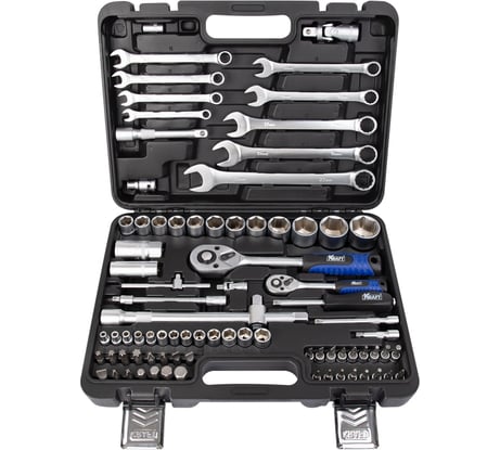 Содержит : Головки торцевые, рукоятка трещёточная, отверточная; биты; удлинители; карданный шарнир;ключи шестигранные и прочее