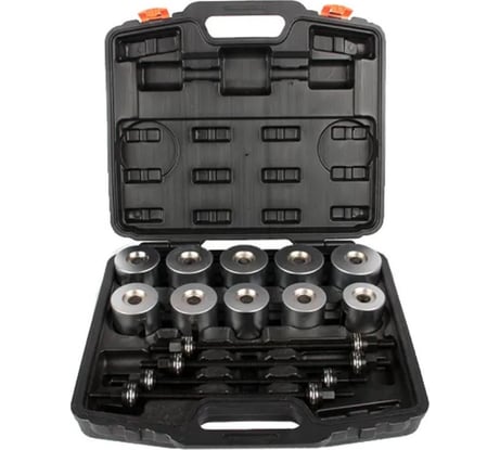 Довольно полный набор, но можно было ещё добавить пару гильз меньшего диаметра. Менял сайлентблоки на BMW E92 - на передних изогнутых рычагах- но шпильками не пользовался, подбирал гильзы по размеру и использовал пресс. Потом на нижних рычагах Кайрона- запрессовывал шпилькой на 14 и гильзами, извлекал немного по другому. Центральные 2 сайлентблока выпрессовывал на прессе, туго шли, до 15 тонн показывал индикатор, использовал гильзу внизу, а вверху оправку на 39 из набора Мастак 100-20049С. Потом менял сайлентблоки передней балки и передних рычагов Тиида, на балке пытался шпилькой на 16 воспользоваться, сделал натяг, но не пошло и не стал насиловать, пошёл на пресс, и той же оправкой на 39 выпрессовал. Запрессовывал шпилькой и подобранными гильзами, зашло легко. На рычагах сайлентблоки и шаровые менял гильзами на прессе. Набор хороший, но надо соизмерять возможности шпилек, если заржавело, то не стоит их портить чрезмерным усилием. Набор не панацея, но во многих случаях хороший помощник, не надо копаться в каких-то своих случайно подобранных оправках, выбрал готовую из набора- и работай. Оправки крепкие.