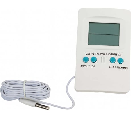 длинный внешний провод, запоминает мин и макс температуры отдельно для внутреннего датчика и внешнего