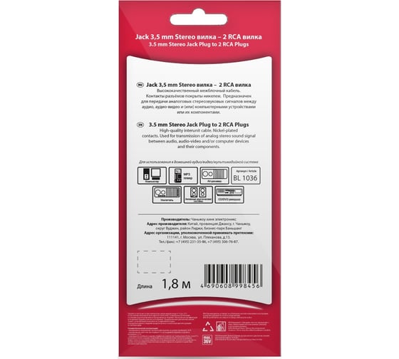 Кабель Jack 3.5 mm вилка - 2xRCA вилка, стерео-аудио, 1.8м Belsis BL1036