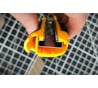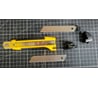 жесткая блокировка лезвия, 2 сменных лезвия внутри корпуса, обрезинивая ручка, к колпачке "обламывать" лезвия. гайка на фиксаторе лезвия металическая