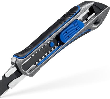 Шикарный нож за приемлемую цену. Полностью металл, так что не ломается при падении. Лезвие жёстко фиксируется вертушкой. Направляющие держат даже очень сильный нажим. Было у меня несколько десятков пластиковых ножей, ломались очень быстро, несколько двухкомпонентных, также ненадолго хватало, и несколько металлических, более долговечных. У них лезвием постепенно прорывало тонкий металл направляющих лезвия. Этот зубр самый лучший, уже долго живёт и сдаваться не думает. Направляющие из толстого металла.