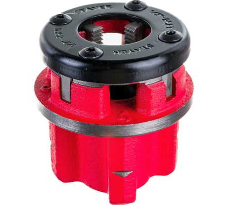 Сначала пришлось разобрать сие чудо и установить все 4 резца ровно, чтобы можно было накрутить на готовую резьбу. Внутренний диаметр 28 мм, а не 27. Пришлось намотать несколько витков малярного скотча на трубу, чтобы клупп не болтался на трубе и резьба не пошла криво. Чтобы начать нарезАть резьбу, пришлось сделать 4 неглубоких проточки на трубе, чтобы резцы клуппа заехали поглубже на трубу - иначе начать нарезку не получилось. В общем смог со смазкой нарезать 3 витка, чего хватило для захвата резьбы плашкой. Рекомендую плашку 9ХС ТМ Туламаш, которой в итоге удалось нарезать 50 мм резьбы на нескольких трубах из нержавейки (износа плашки при этом не было заметно).