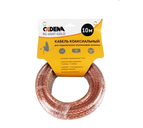 Кабель CADENA RG6 был куплен за 390 руб. 21 декабря 2021 г. в виде 15-метровой бухты с уже смонтированными на концах кабеля F-разъёмами и одним переходником от F-разъёма к антенному гнезду телевизора. Как видим, это кабель, готовый для подведения сигнала к телевизору от разветвителя или распределительной коробки, имеющих выход в виде F-разъёма с наружным диаметром резьбы 9,5 мм. Наружный диаметр бухты 149 мм. Высота бухты 59 мм. Масса бухты 547 г. Диаметр центральной стальной жилы кабеля (которая магнитится и покрыта медью) 1,02 мм. Экран состоит из алюминиевой фольги и плетёнки, сделанной из неизвестного металла, белого и блестящего. Плетёнка не магнитится, не паяется (ни с какими флюсами), не ржавеет, достаточно жёсткая, чтобы оказаться алюминиевой. Если плетёнку поскоблить острым ножом, то цвет её металла не меняется, но в растворе едкого кали (KOH) она кипит, то есть растворяется - значит это, всё-таки, алюминий. Суммарное сопротивление постоянному току центральной жилы и оплётки всего кабеля составляет 2,40 Ом, то есть погонное электрическое сопротивление равно 2,4 Ом/15 м = 0,16 Ом/м = 160 мОм/м. Изоляция между центральной жилой и экраном выполнена из вспененного пластика с наружным диаметром 4,5 мм, твёрдого. При сильном сдавливании изоляция сминается, а после снятия давления её первоначальная форма не восстанавливается. Диаметр внешней ПВХ-оболочки кабеля 6,60 мм. F-разъёмы на концах кабеля сделаны из металла хорошей толщины, не хлипкие, имеют хорошие резьбы и закреплены способом шестигранного обжима цилиндрического корпуса разъёма вокруг экранной плетёнки. После демонтирования разъёмов повторное их использование достаточно проблематично, лучше использовать новые "навинчивающиеся" F-разъёмы.