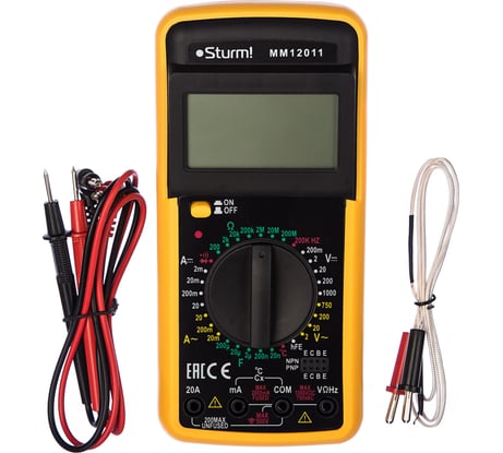 Заявлено измерение переменного и постоянного напряжения, силы тока, сопротивления, температуры, ёмкости, прозвонка с проверкой диодов.