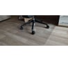 Жесткий. Прозрачный. Хорошо прилегает к ламинату. Не задирается под креслом и ногами.