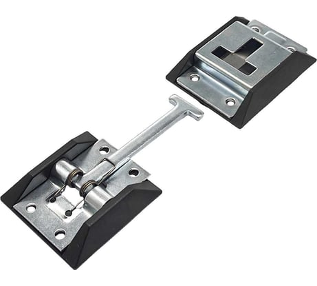 Надежная конструкция, оцинкован, подпружинены как язычок фиксатора, так и ответная часть. Пластиковая подкладка.