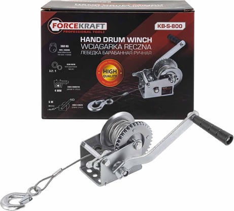 Отзыв Лебедка ручная барабанная Forcekraft 360 кг, стальной трос, диаметр троса 4 мм, длина троса 6 м FK-KB-S-800(48585)