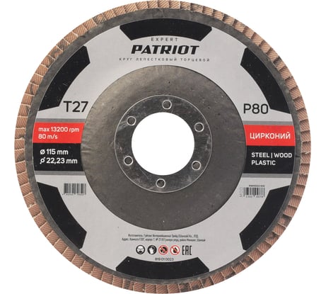 Отзыв Круг лепестковый торцевой EXPERT 115x22.23 мм, P80, цирконий Patriot 819010023