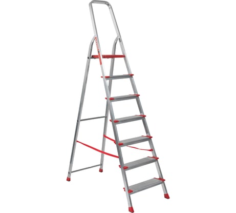 Сравнивал с аналогичной от Алюмет, прям рядом поставил и смотрел, в итоге сделал выбор в пользу гигантовской. На самом деле, они очень похожи, но на этой стремянке побольше и потолще пластиковые накладки на бортиках, у алюмета они более хлипкие и мелкие. Каждая ступенька сидит на шести заклепках, по три на сторону. Стремянка очень легкая, на ровной поверхности - устойчивая. Ширина ступеней - 80 мм, неплохо, это не 120 мм, как у Краузе, конечно, но там и ценник совсем иной. За эти деньги - рекомендую, полезная вещь.