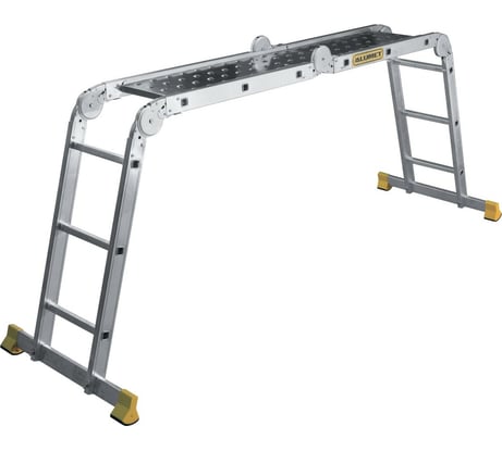 Взял для дачи – очень удобная штука! Четыре секции можно разложить по-разному, и как обычную приставную, и как стремянку, и даже под углом для работы у крыши. Шарниры фиксируются крепко, не люфтят. Ступени рифлёные – даже после дождя не скользкие. Весит немного, таскать легко, а выдерживает мои 100 кг хорошо. Стабилизатор придаёт устойчивости, но на неровной поверхности лучше подстраховаться.