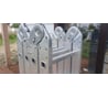 Главный недостаток- слабость соединительных шарниров (замков), изготовленных из того же алюминиевого сплава, а не из стали. Под полной нагрузкой не проверял, но даже небольшое давление на центр при раскладке "стол" показало люфт и опасность прогиба, что может тем более отразиться на прочности и устойчивости при эксплуатации при полной раскладке в длину. Второй недостаток - вес. Хотелось бы легче, но объективности ради отмечу, что это каприз. При такой длине сделать легче - это ещё больший ущерб безопасности и надёжности. Третий недостаток - ширина ступеней. Требуется увеличение этой характеристики, поскольку не очень удобно работать, стоя двумя ступнями (как обычно и происходит), которые повернуть или переступать ими при такой ширине ступеней не комфортно. Четвёртый недостаток - недостаточное число углов фиксации замков (всего два угла), что ограничивает варианты применения лестницы. Пятый недостаток - в комплекте отсутствует площадка необходимой длины для работы в качестве "стола", поскольку найти её для такого пролёта или делать самому, чтобы была лёгкая и прочная, проблематично.
