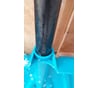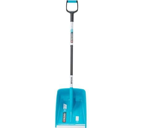 Съемный черенок на поджимающей его втулке-кнопке (но всё равно требуется дополнительный саморез для нормального прикрепления черенка к стыковочной канавке лопаты, спец. место предусмотрено для его вкручивания). Черенок с оваловкой (не строго круглый), значит, не прокручиваемый под воздействием перемещаемой массы снега, хват под мужскую ладонь. Что еще... стильный бирюзовый цвет,