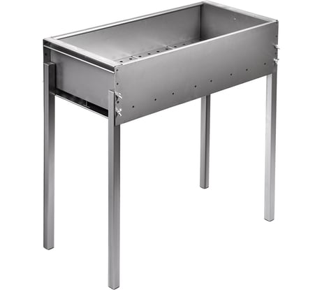 Достаточно толстая сталь, бортики подогнуты сверху поэтому не деформируются, ножки на "барашках", собирается легко, устойчивый, размеры позволяют разместить две решетки или 10 широких шампуров. Сама конструкция хорошо продумана - есть колосник и боковые сдвижные крышки для открытия/закрытия доступа воздуха, таким образом можно быстро "раскочегарить" затухающий уголь. Самое главное - не жрет уголь! Как раз из-за вышеописанной конструкции. Пользуюсь уже 5 лет - ничего нигде не прогорело.