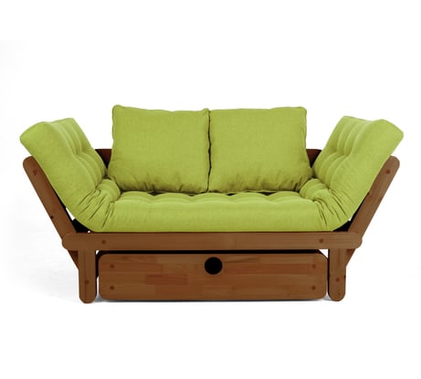 Действительно массив, измазался в смоле после распаковки, почему то не прокрашено основание под сидение. Подушки отстегиваются/убираются, жесткие, присутствует запах клея. Материал обивки из разряда "практичный". Подлокотники имеют 3 положения: вертикально, под углом и параллельно земле (опция "разложенный под одно спальное место"). При параллельном варианте подлокотник держится на углу просто вырезанному в массиве и ничем не укрепленному. При вертикальном варианте, на том же самом углу, плюс упирается в просто утопленную в центр ножки из массива деревянную пробку. Вариант под 45 градусов самый надежный по конструкции. Никаких лифтовых механизмов и стабилизаторов нет, подлокотники свободно перемещаются между креплениями. При получении обнаружил трещину подлокотнике в месте вырезанного крепежного угла с правой стороны. А так же в месте пробки треснула по середине ножка с левой стороны. Упаковка совершенно не защищает эти слабые места конструкции. Да и в целом, мне не ясно, зачем отправлять кушетку в собранном виде, проще собрать дома, по крайней мере соединение самых крупных элементов конструкции. Поэтому претензия скорее к производителю, доставка просто стала рискованней из-за этих моментов. А экономия на крепеже, сильно повысила риск поломка дерева. Сдал товар обратно. Доставка и менеджмент магазина отработали отлично. Производителю стоит подумать об улучшении конструкции и упаковки, это, по всей видимости, касается всей серии данных кушеток.