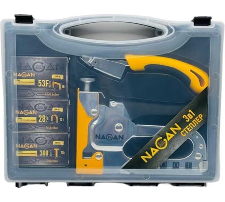 Отзыв Набор в кейсе NAGAN Степлер 3в1 ( Скобоудалитель, скобы (3х500 шт) строительный Тип U,T,П) металлический, регулировка удара, двухкомпонентная рукоятка НГ-НСМ-030-05