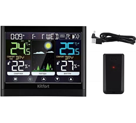 Три датчика в комплекте и на них самих показывается температура и влажность. Дальность связи датчиков с базой.