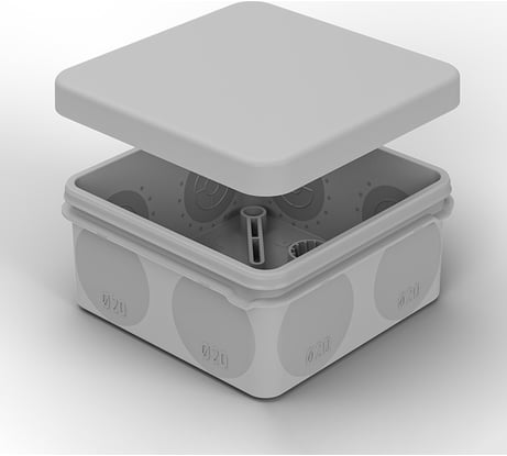Коробка в комплекте с заглушками. Материал заглушек отлично режется монтажным ножом под диаметр кабеля при монтаже. Всё супер. Монтировал во внутреннем помещении супермаркета.