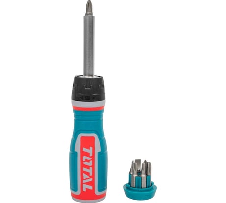 Храповик на 36 зубов, пытался сорвать ее с помощью шестигранника- не получилось. 6 бит с собой. Съемный битодержатель, можно использовать как мини отвертку.