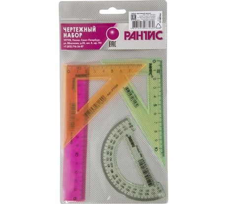 Полный набор фиксированных углов и транспортир. Небликующая линейка.