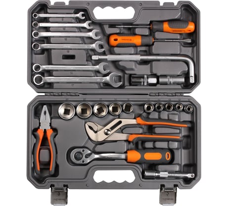 Хороший набор инструментов. Есть всё необходимое. Ключи мощные, рукоятки трещоток удобные, металл хороший, для ремонта авто и мото самое то!