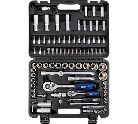 Содержит : Головки торцевые, рукоятка трещёточная, отверточная; биты; удлинители; карданный шарнир;ключи шестигранные и прочее