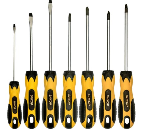 Длина жала 50мм. Ну допустим. Хотя 40мм было бы достаточно. Длина ручки 100мм. Для чего такая длинная, да ещё и чуть-чуть кривенькая. В результате общая длина 150мм. Держишь в руке и понимаешь, что производители больны гигантизмом. 8 огромных отвёрток поместили в огромный кейс. И где теперь это счастье хранить? Двухкомпонентность ручек выразилась в том, что в нижней части на жёлтую пластмассу нанесена черная краска типа резины. Несколько смешно, но за эту цену сойдёт. На отвертках, почти не отличающихся друг от друга не нанесена маркировка. Пришлось усовершенствовать.