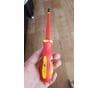 Небольшая цена, удобная прорезиненная рукоятка. Жало покрыто чем то - чёрное пористое покрытие, попробовал покрутить автоматы, покрытие начало слезать. Сам стержень утончен (в отличии от других изолированных отверток), благодаря этому можно крутить крепёж в шинках и глубоких автоматах
