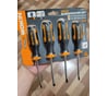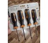 Хороший набор. Особенно порадовал цвет ручек - для гаража нормально. Сталь - не сыромятина. Покрутил большим крестом черные саморезы - четверки в дерево. Не облизало ничего. Непревычно, что ручка необрезиненная, целиком из полиэтилена. По эргономике номально. Шлицы намагничены, маленькая отвертка надежно держит один винт, большие примагничивают сразу кучку.