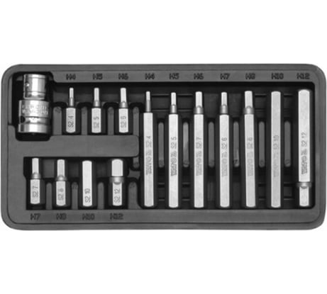 Раз в описании не сказано, какие головки есть в комплекте, перечислю содержимое набора - головки Е5, Е6, Е7, Е8, Е10, Е12, Е14, Е16 и переходник M1/4 на F3/8.