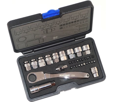 Отличный набор для работы в труднодоступных местах. Кейс компактный и крепкий, в сумке не раскроется, а если раскроется, все будет на своих местах. Биты и головки крепкие, даже приходилось работать ударным шуриком. Покрытие устойчивое к царапинам. Минус: слабая фиксация положения трещетки, от малейшего касания при нагрузке, переключается в противоположную сторону.