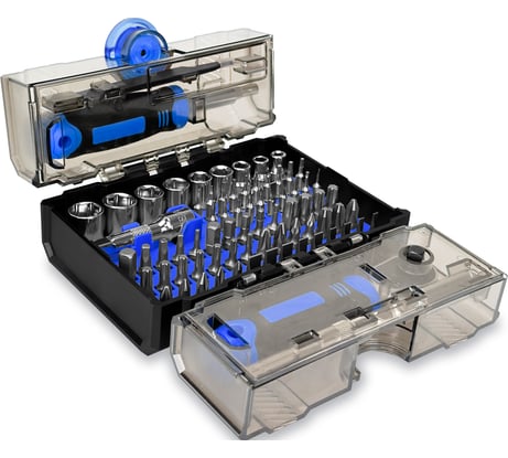 Неплохой комплект,много бит и головок,компактный.