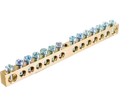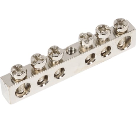 Небольшая компактная шинка. Рассчитана на ток в 100А. Часто данную шину можно встретить в базовой комплектации встраиваемых или навесных щитов данного производителя. Позволяет выполнить подключение до 8 отдельных проводников. В центре расположено отверстие с резьбой для крепления к монтажной рамке или изолятору. Сама шина выполнена из латуни. Для подключения проводников суммарно имеется 8 отверстий: 2 (по краям) диаметром 6мм, позволяют подключать проводники сечением до 16-25мм2 в зависимости от способа заделки кабельного наконечника; 6 (ближе к центральной части) диаметром 4мм, позволяют подключать проводники сечением до 6-10мм2 в зависимости от способа заделки кабельного наконечника.