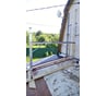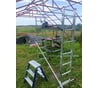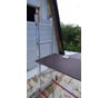 Собирался обшивать новой вагонкой фронтон на даче. Фронтон находится над наклонной крышей пристройки, думал лестницу как-нибудь прикрепить. И тут сайте "Все инструменты"обнаружил подмости Краузе Корда 2х5, да ещё и акция на них была. А один из отзывов, ну прямо мой случай: фронтон и наклонная крыша пристройки. Подмости подошли отлично, благо что на крыше пристройки нет никакой металлочерепицы, а только новая сплошная обрешетка, закрытая тентом. До совсем вертикального положения опоры удалось довести, подложив под дальние подпятники несколько дюймовых досок. Чтобы вся конструкция не стремилась съехать вниз, в основание фронтона были вкручены два шурупа с кольцом (10х120) и подмости были зафиксированы стяжным ремнём. Безусловно, подмостями можно пользоваться и так: "прямо из коробки". Но поскольку мой личный вес более 100кг., решил добавить жёсткости данной конструкции. Понадобились два стальных прутка 16мм., две стяжки от другой туры (на фото красные), хомуты, шайбы. Всё! Я даже прутки не стал укорачивать, так надел на "лишние" хвосты обрезки шланга. Получилось очень хорошо.
