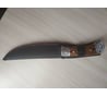 Слесарка ужасная, сведение к кончику ломовое (подводы около 1 мм.), рукоять угловатая, металлический хвостовик при обратном хвате неприятно впивается в ладонь, ножны... да это не ножны. Заточка с завода НИКАКАЯ, бумагу не резал от слова совсем, угол около 45°. Если снять деревянные накладки с рукояти, оказывается, что изнутри они не пропитаны.