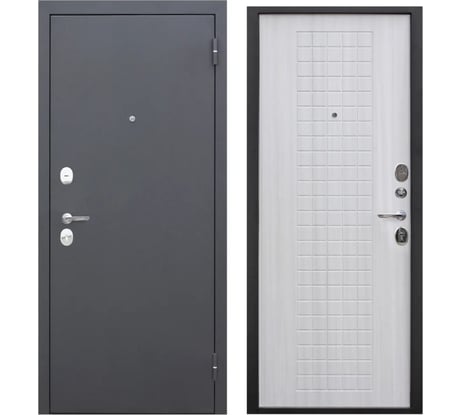 Толстая, зеркало, глазок, два замка, ночная задвижка, крепится в 6 местах, при дополнительной регулировке закрывается мягко, достаточно тяжёлая.