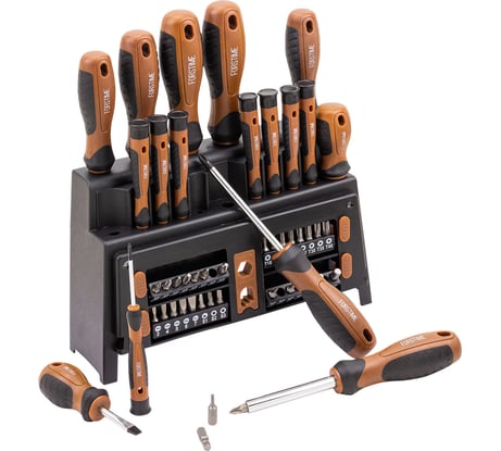 Недорогой для такого количества единиц инструмента, возможность закрепить на стену. Наборы бит стоят в нишах и не вываливаются, по нажатии на кнопку - открываются для доступа.