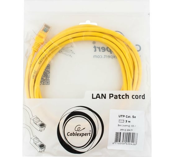 Многожильный патч-корд Cablexpert UTP кат.5e, 10м, литой, жёлтый PP12-10M/Y