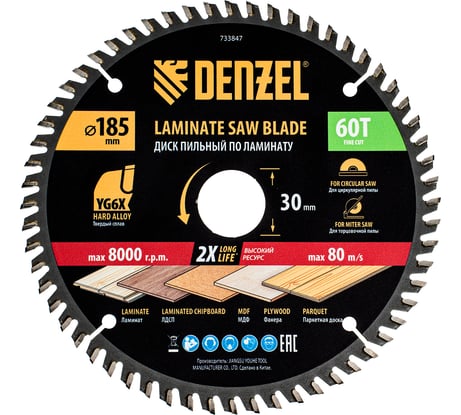 Отзыв Пильный диск по ламинату DENZEL 185x30 мм, 60 зубьев 733847