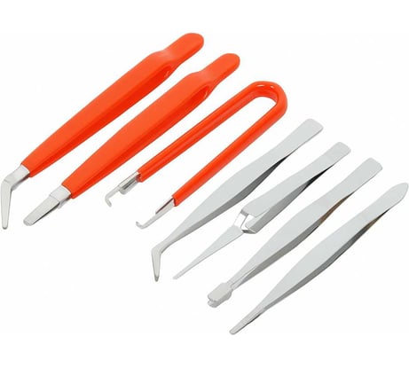 Набор из 3 пинцетов с диэлектрическим покрытием и 4 обычных. Все разного типа. За указанную цену, неплохой выбор. Все пинцеты, кроме с Г-образными губками, с фиксаторами открытия. Все пинцеты из набора, сильно притягиваются магнитом. Диэлектрическое покрытие плотное, самопроизвольно с пинцетов не сползает.